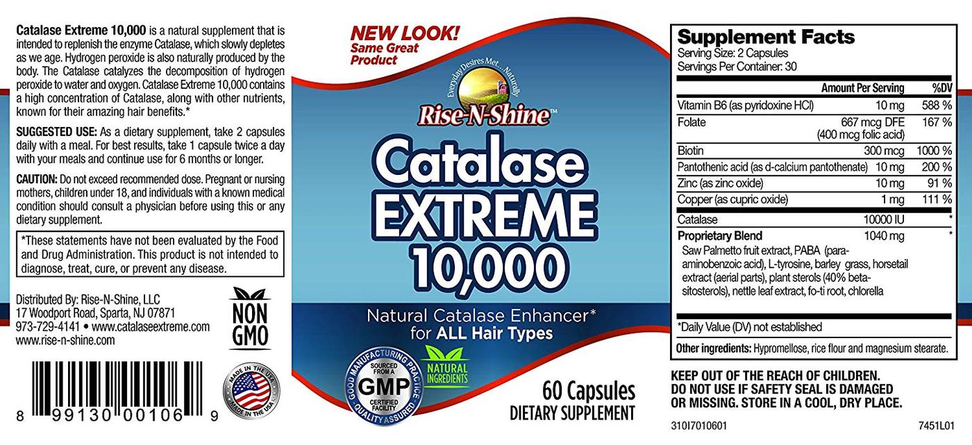 Catalase Extreme 10,000, by Rise-N-Shine, is an enzyme supplement with 10,000 units of the enzyme Catalase, along with Biotin, Foti, PABA, Saw Palmetto & many more powerful nutrients. Catalase Extreme 10,000 is specifically formulated for your hair by featuring a super concentration of Catalase.