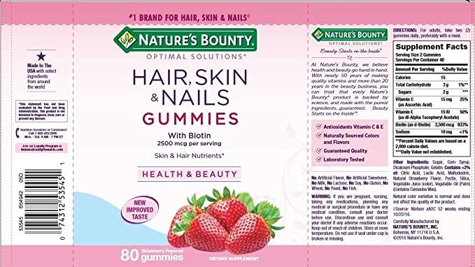 - WITH BEAUTY-SUPPORTING BIOTIN: Nature's Bounty Hair, Skin & Nails Gummies contain beauty-supporting biotin, a vital nutrient that helps to maintain healthy hair while supporting overall beauty.*